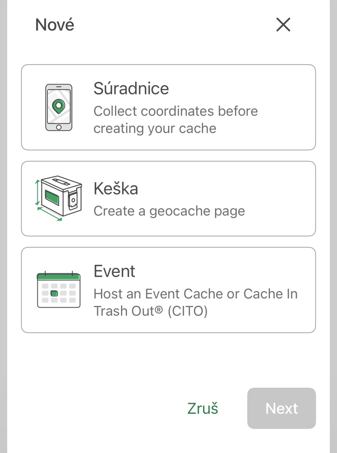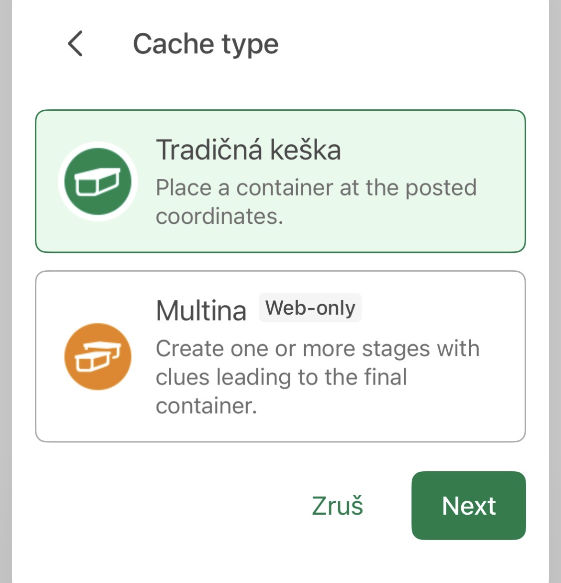 Ak ešte nemáš krabičku fyzicky umiestnenú, môžeš rozpracovaný listing uložiť a dokončiť neskôr, buď v appke (Hides → Unpublished) alebo na Geocaching.com. Ostatné typy kešiek zatiaľ cez appku vytvoriť nejde, tie ťa presmerujú na web.