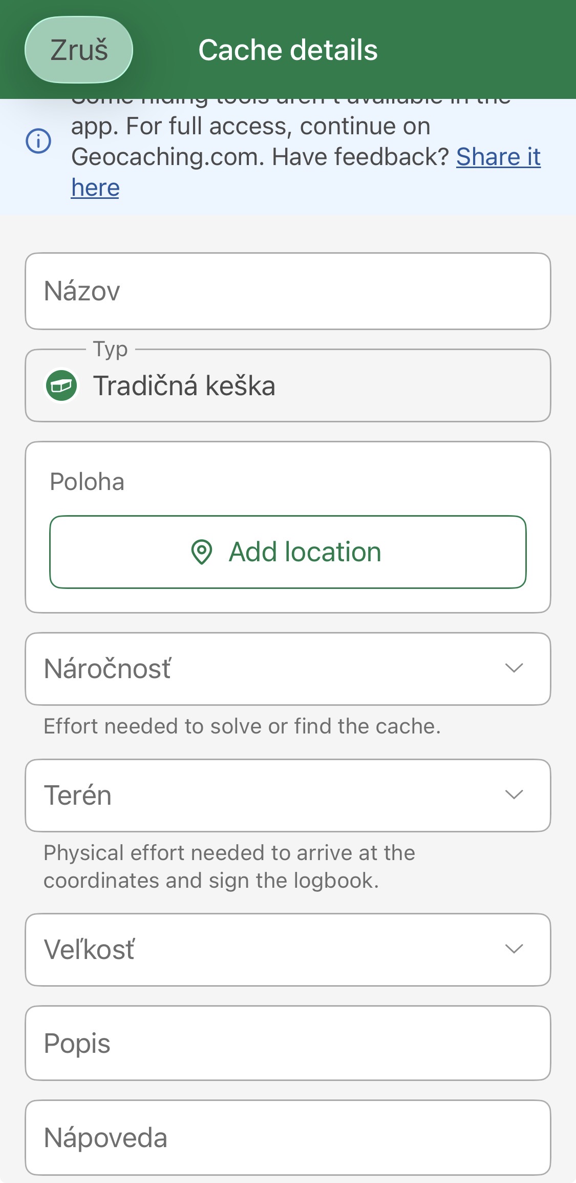 Ak ešte nemáš krabičku fyzicky umiestnenú, môžeš rozpracovaný listing uložiť a dokončiť neskôr, buď v appke (Hides → Unpublished) alebo na Geocaching.com. Ostatné typy kešiek zatiaľ cez appku vytvoriť nejde, tie ťa presmerujú na web.